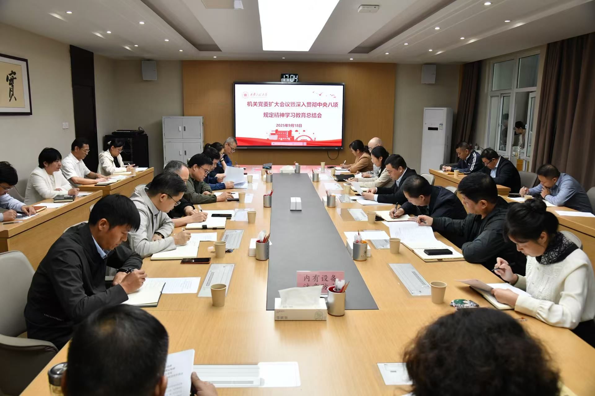9月18日,机关党委在临潼校区行政楼第三会议室召开党委会(扩大)会议暨深入贯彻中央八项规定精神学习教育总结会,深入学习贯彻习近平总书记关于作风建设的重要指示精神和中央党的建设工作领导小组会议、省委常委会会议暨党的建设工作领导小组会议精神,学校学习教育总结会议精神,总结机关党委学习教育开展情况,并就巩固拓展学习教育成果,推进作风建设常态化长效化工作作出安排部署。会议由机关党委书记胡小进主持。